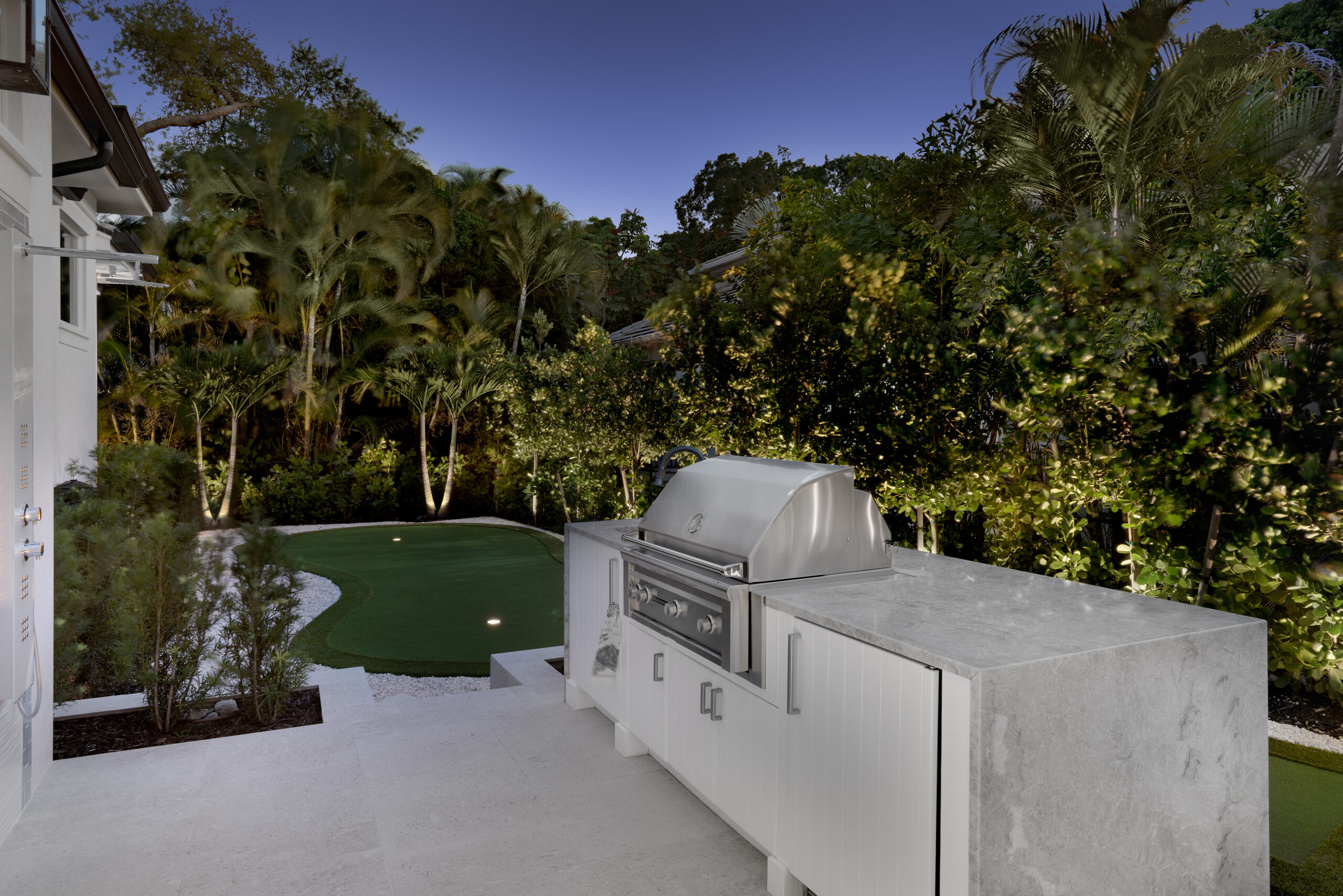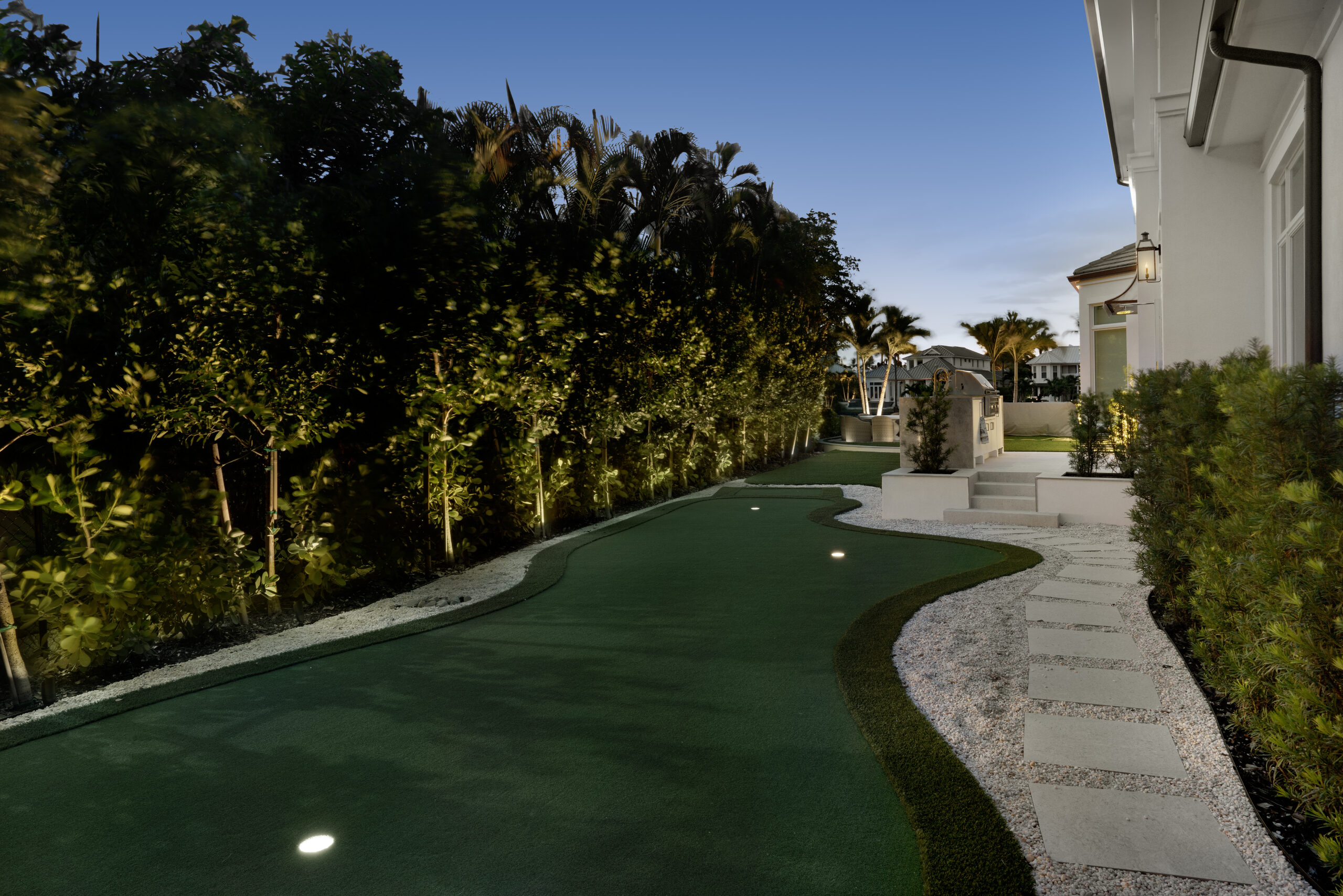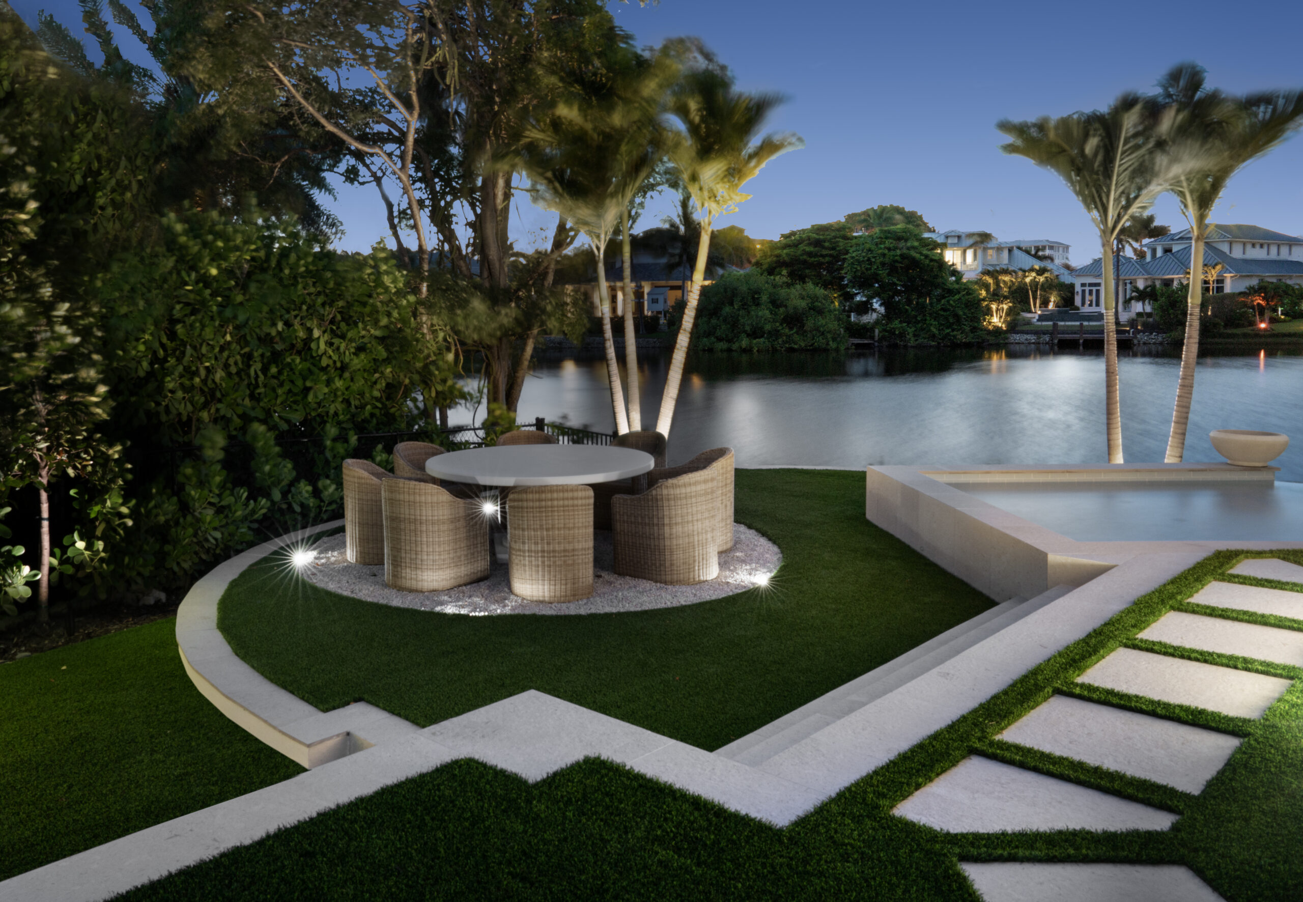 This lighting scheme supports luxury outdoor lighting in Naples, combining aesthetics, utility, and safety.