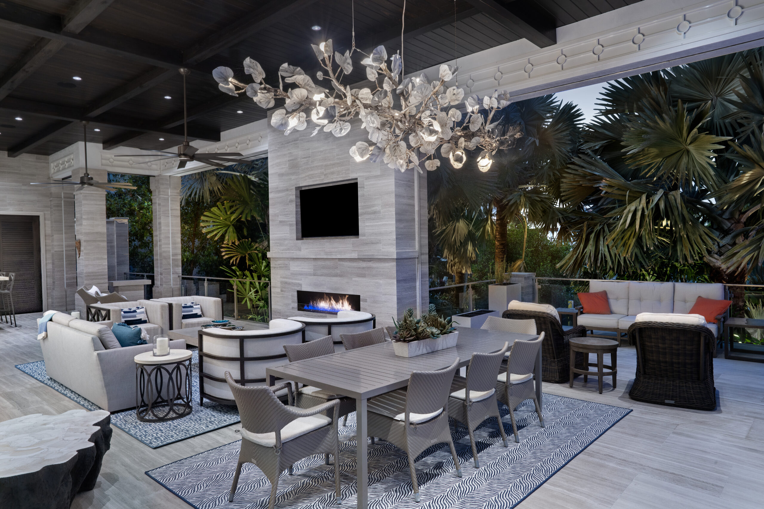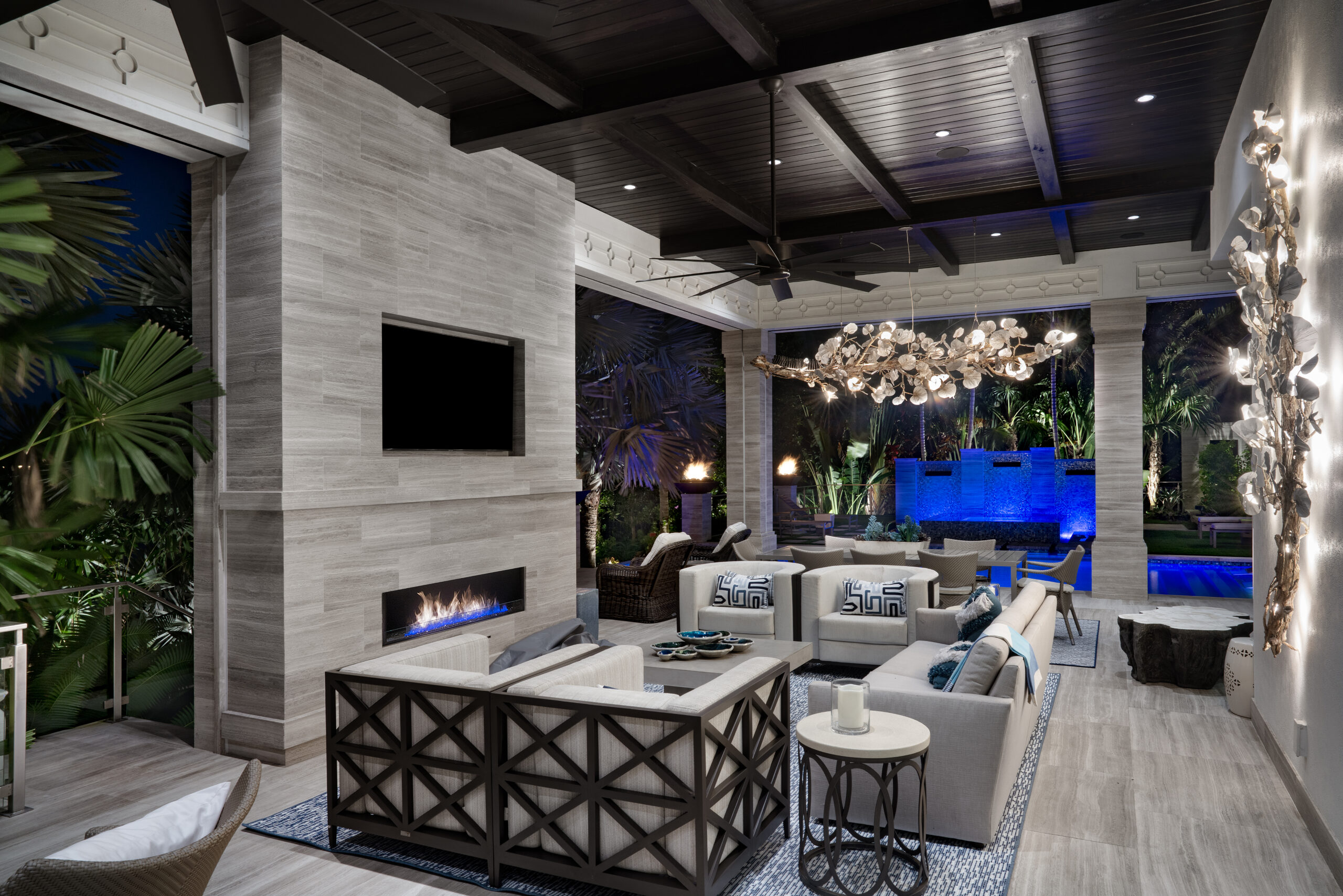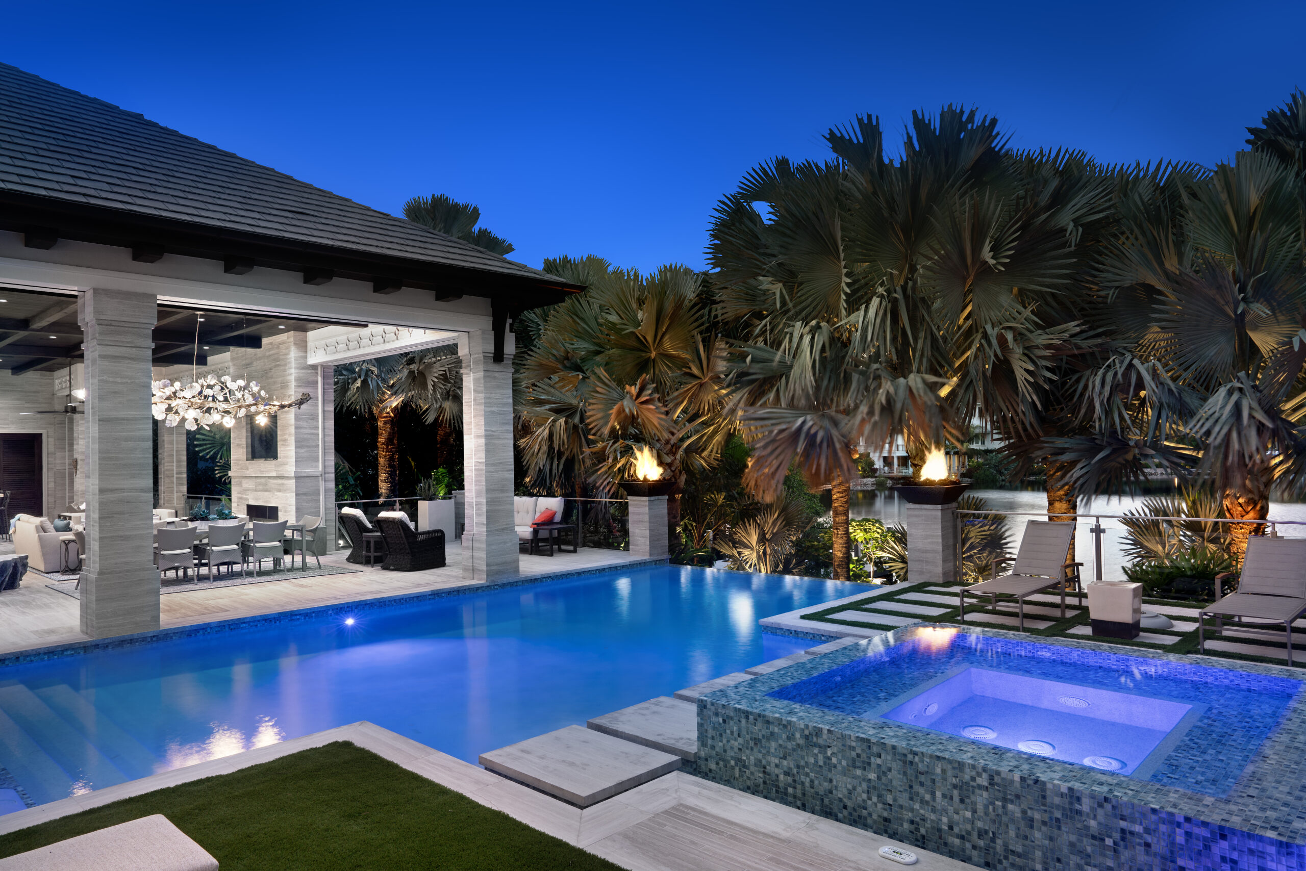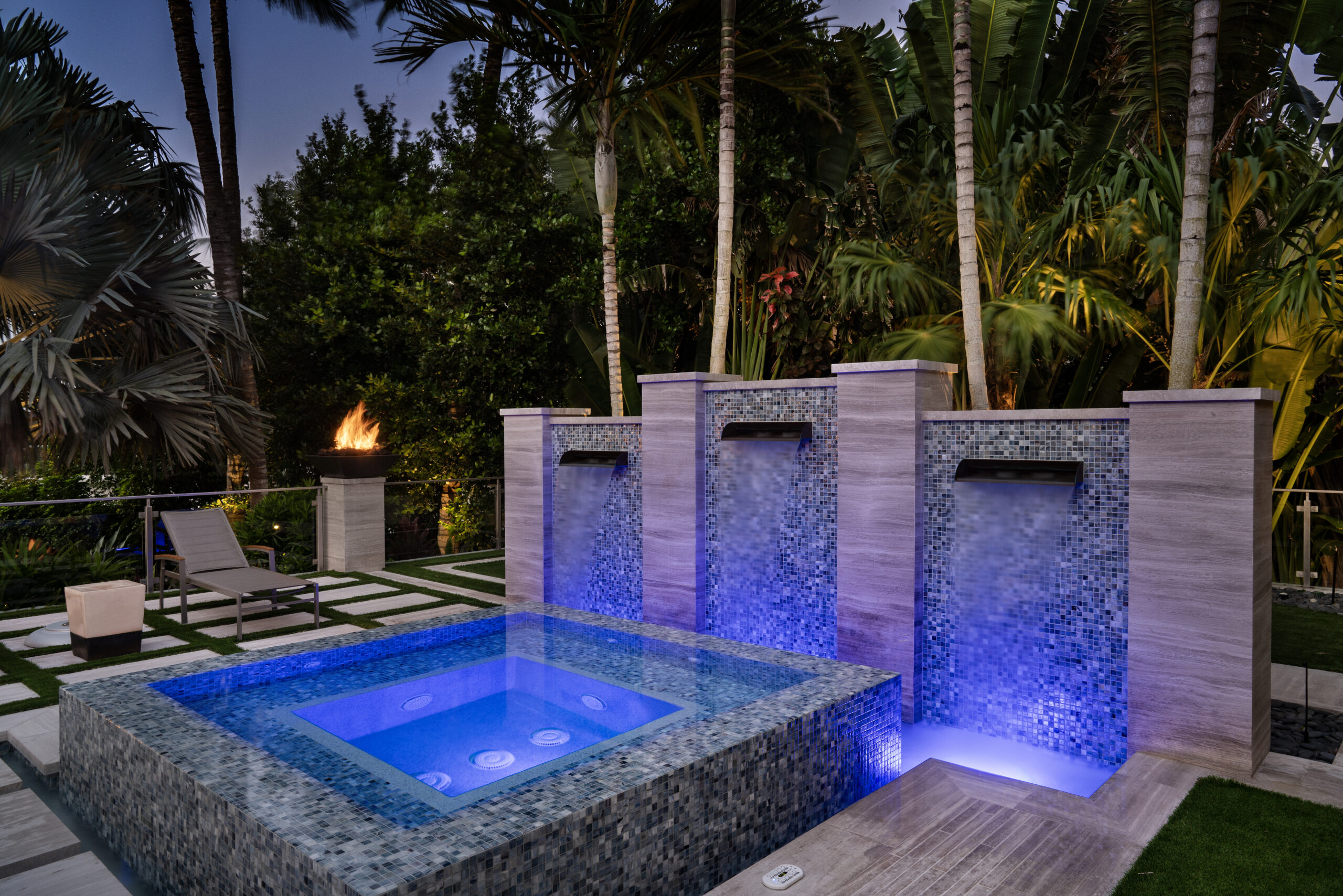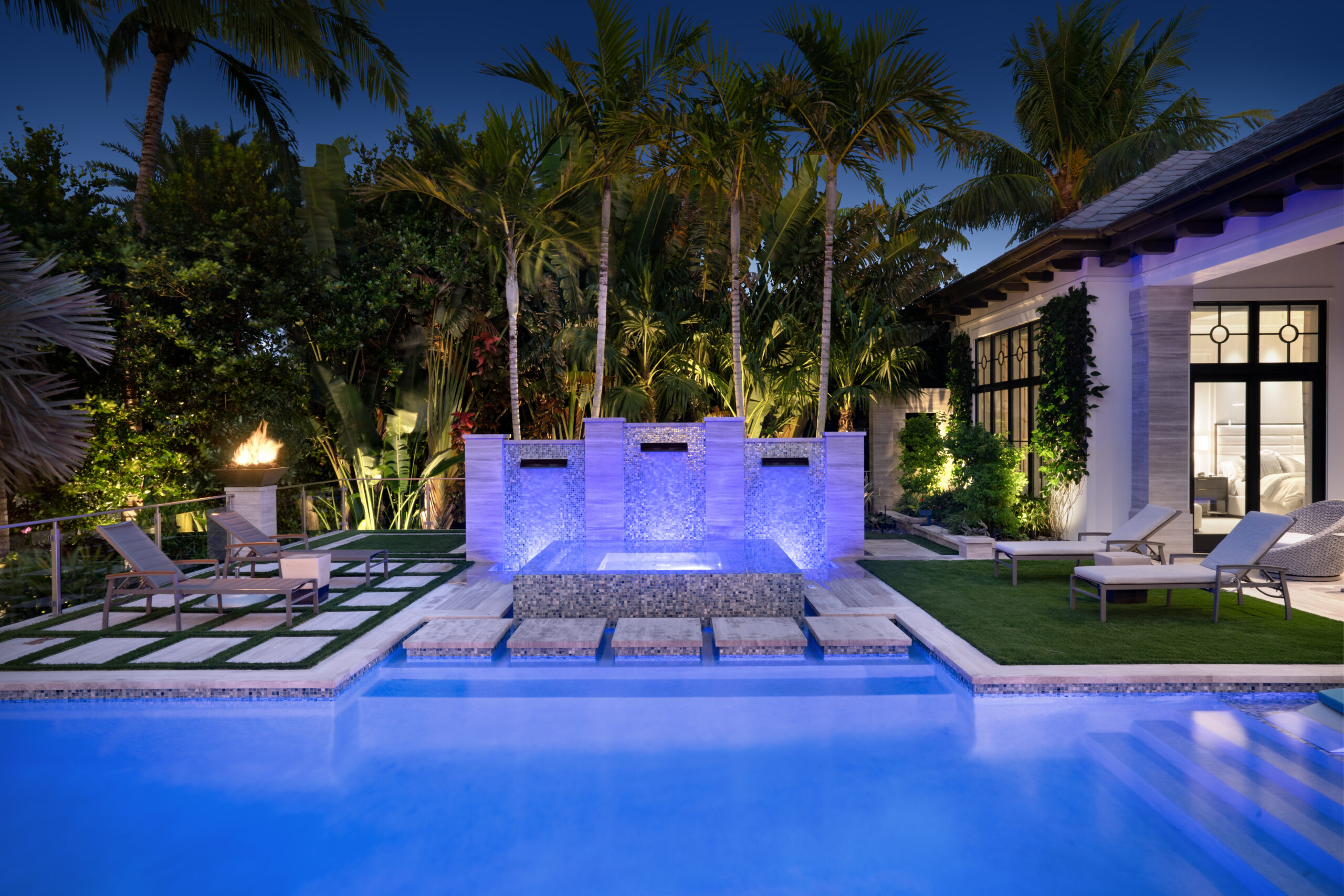 - Integrated fire features were strategically placed to add warmth and contrast, complementing the cooler tones of the aquatic lighting for a dynamic nighttime effect.