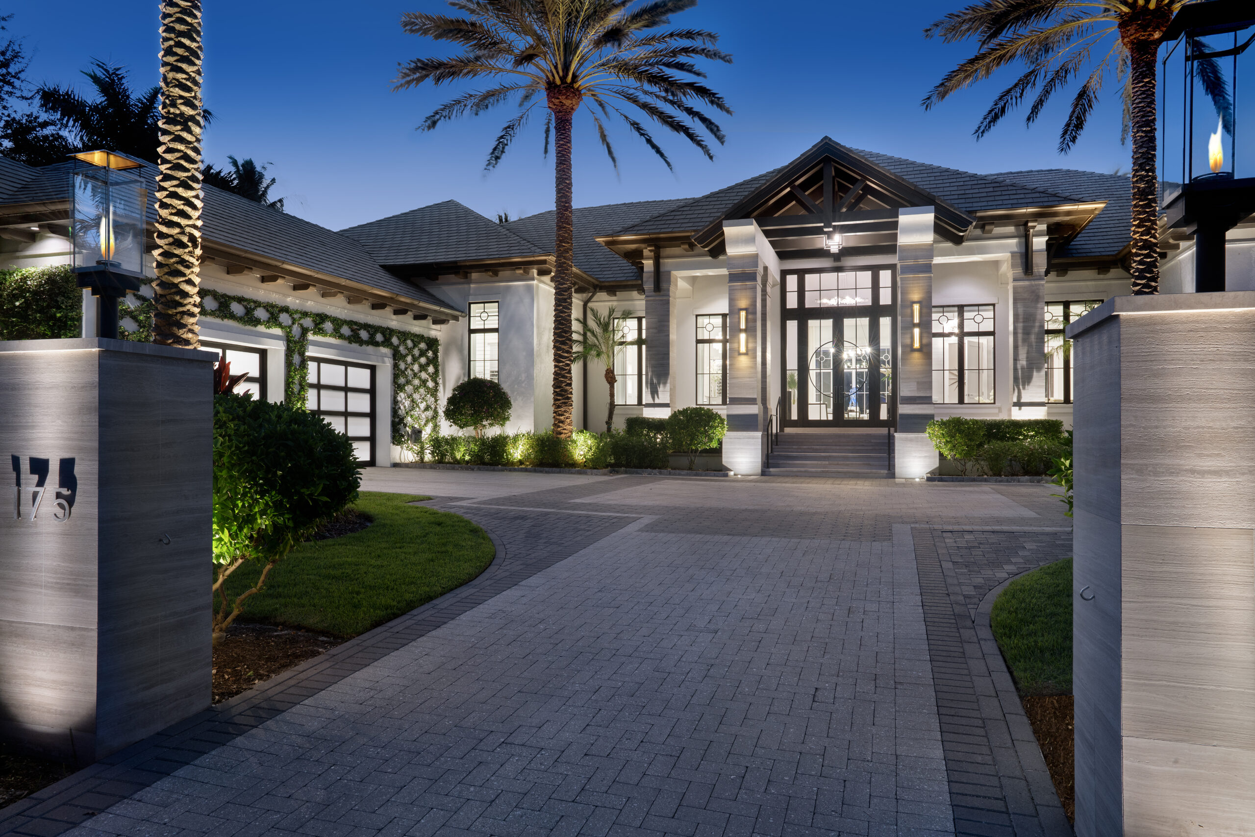 - These fixtures work together to create depth and dimensionality, showcasing the estate’s symmetry and stone details.