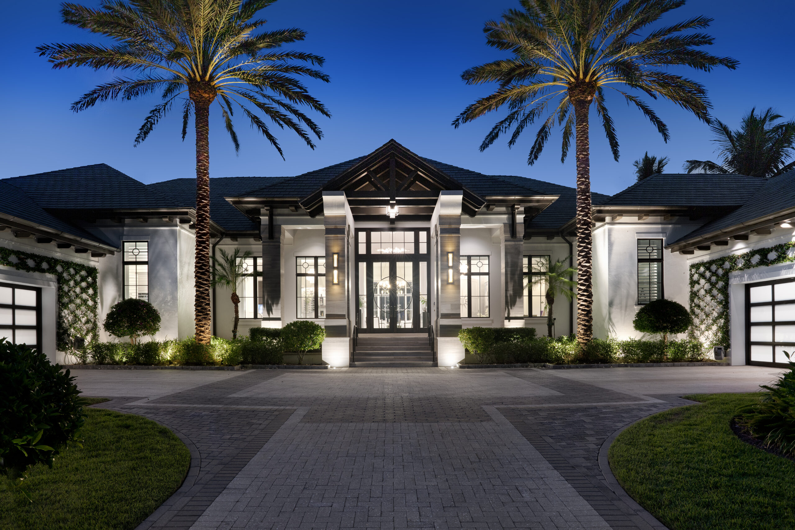 - The home’s dramatic front elevation was elevated with a combination of high-powered up-lights, precision wall washes, and in-grade accent fixtures.