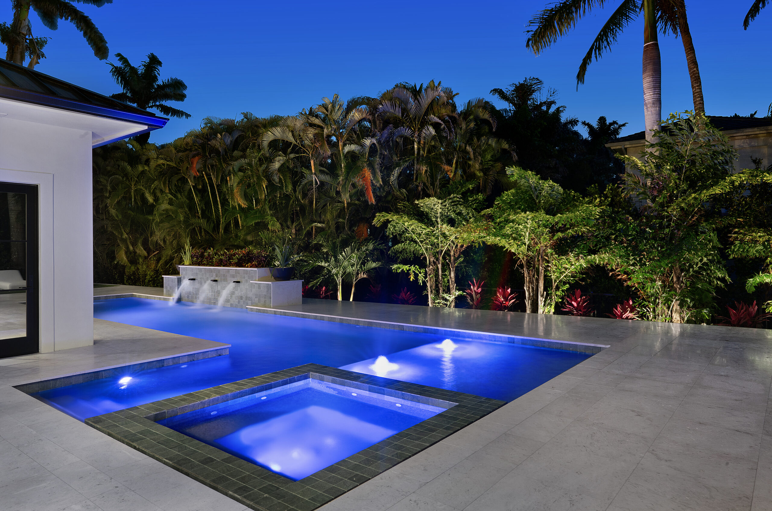Landscape Illumination: Layered lighting for palms and canopy trees, adding dimension from all viewing angles.